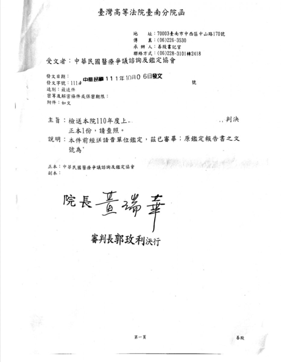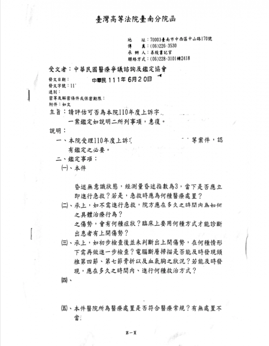 本會於111年6月20日受理臺灣高等法院臺南分院之案件,提供司法人員醫療專業諮詢,對案件中的醫療問題提供專業意見,並協助爭點整理,提供醫療糾紛的專業鑑定。