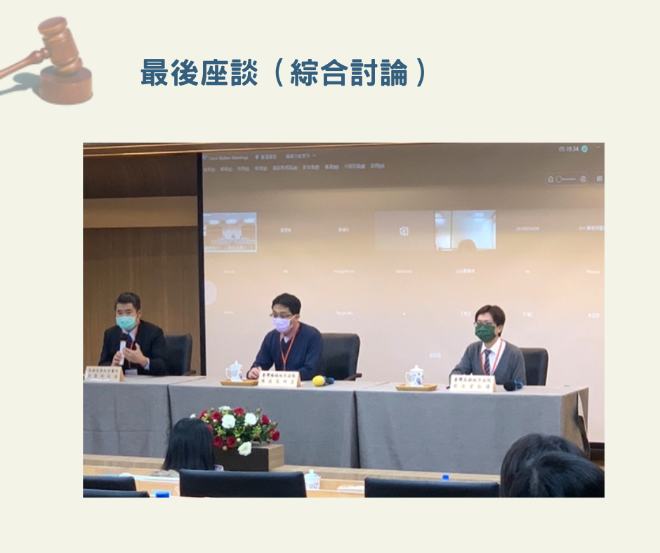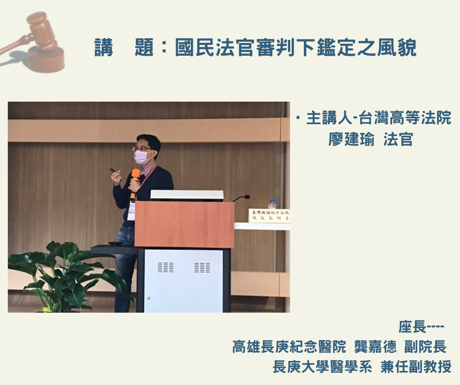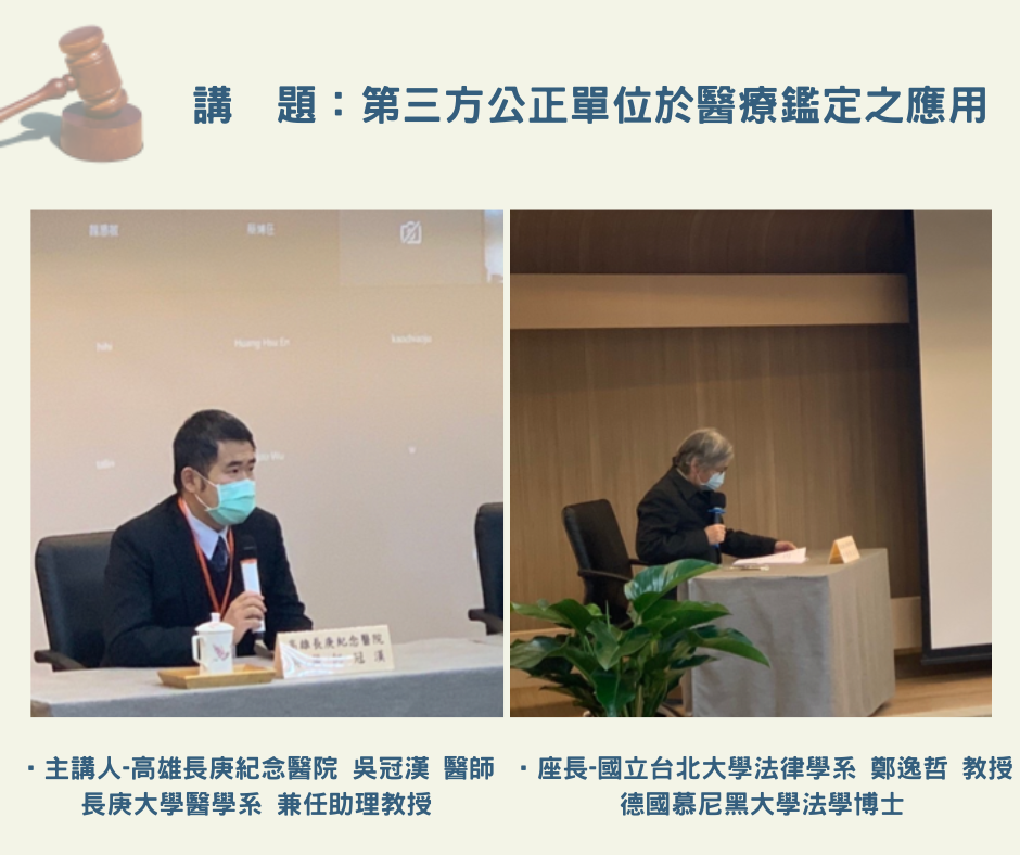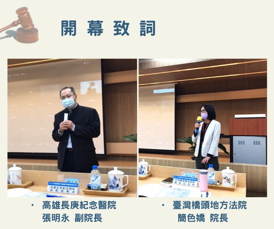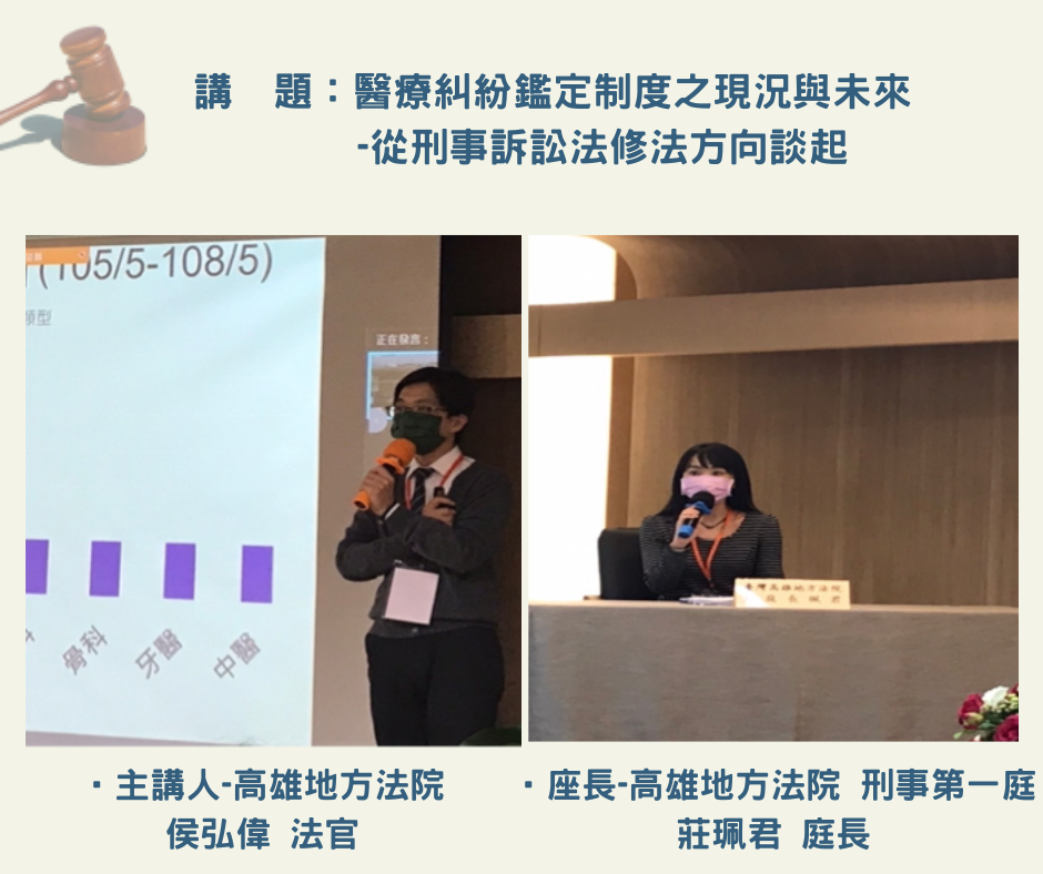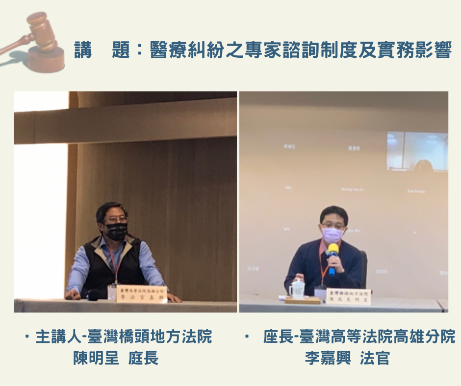 現場特別邀請到臺灣橋頭地方法院簡色嬌院長、高雄長庚張明永副院長、高雄地方法院侯弘偉法官、高雄地方法院刑事第一庭莊珮君庭長、台灣高等法院廖建瑜法官、高雄長庚紀念醫院龔嘉德副院長、台灣橋頭地方法院陳明呈庭長、臺灣高等法院高雄分院李嘉興法官、高雄長庚紀念醫院吳冠漢醫師、國立台北大學法律學系鄭逸哲教授,共同為醫療爭議鑑定制度提供建言。