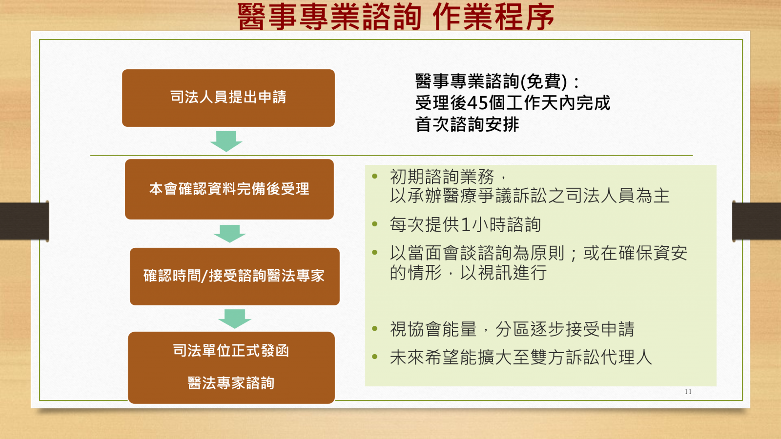 - 本會委請醫法雙修之醫師為您協助確認案件流程及爭點,以期加速案件偵辦審理之速度。在協會成立初期,僅針對「司法官」及「捐款會員」兩類對象提供醫療爭議案件之諮詢服務,未來協會建立起相當公信力後,希望能擴大服務至醫病雙方訴訟當事人。
